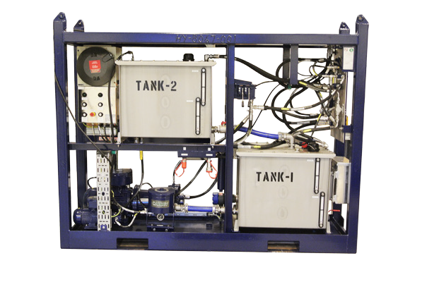 The system consists of two tanks made for hydraulic fluid, one ‘’clean’’ tank and one ‘dirty’ tank. The clean tank is where the oil is taken for the HPU and circulation purposes. The operator can then select the return to come back either to the same ‘clean’ tank or reroute it to the ‘dirty’ tank.